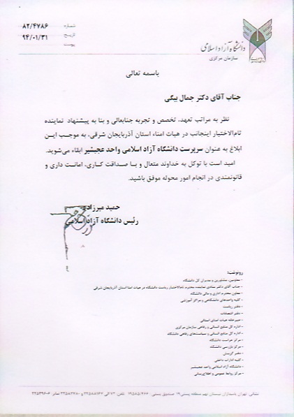 به گزارش فرهنگ عجب شیر :حمید میرزاده، رئیس دانشگاه آزاد اسلامی طی حکمی جمال بیگی را در سمت سرپرستی دانشگاه آزاداسلامی واحد عجب شیر ابقا کرد.