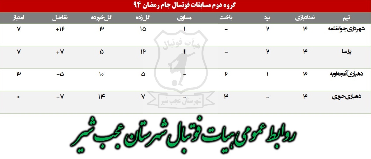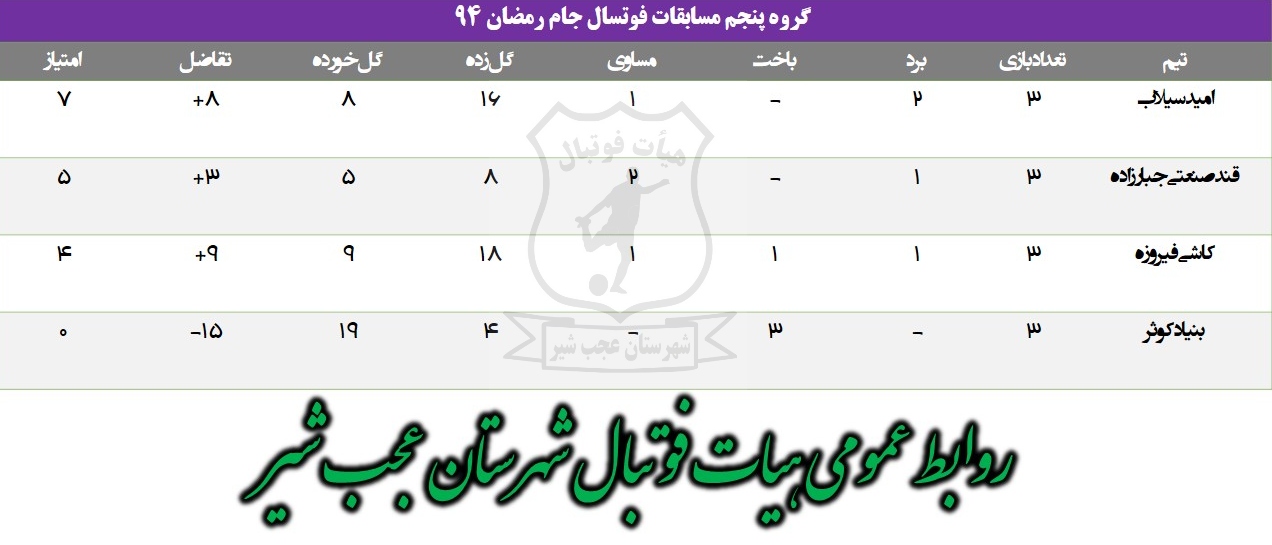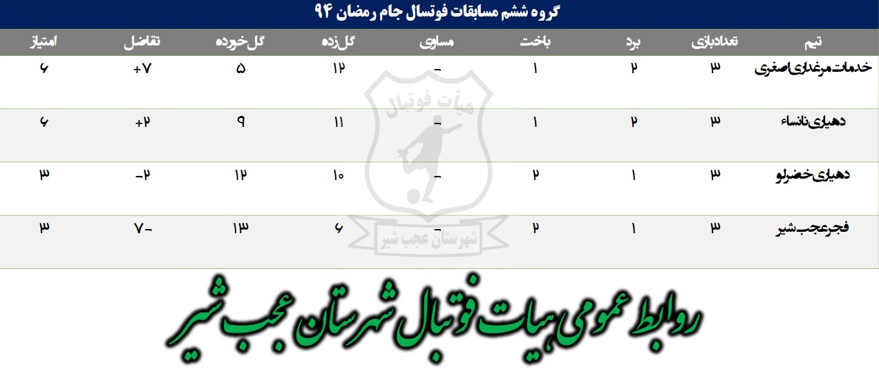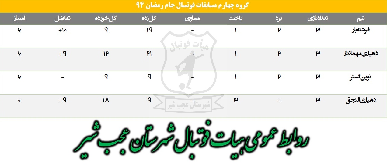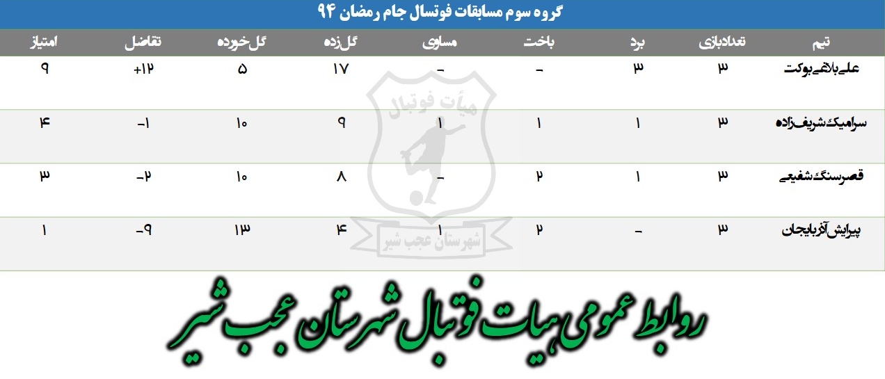 به گزارش فرهنگ عجب شیر، جدول امتیازات گروههای مسابقات فوتسال جام رمضان ۹۴شهرستان عجب شیر به شرح ذیل اعلام شد .