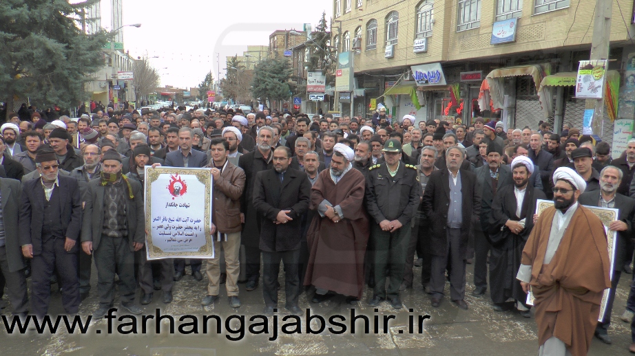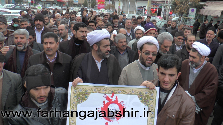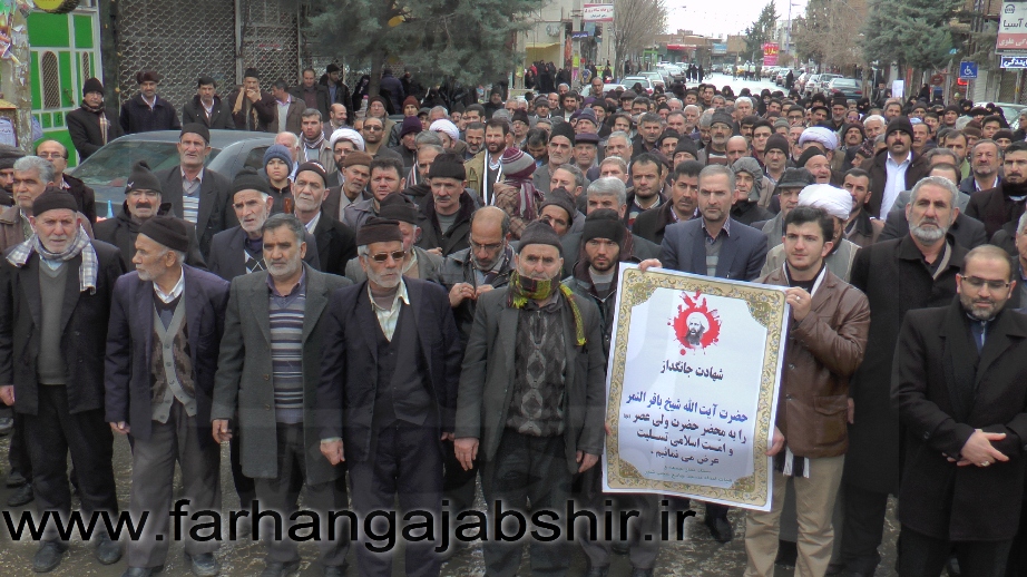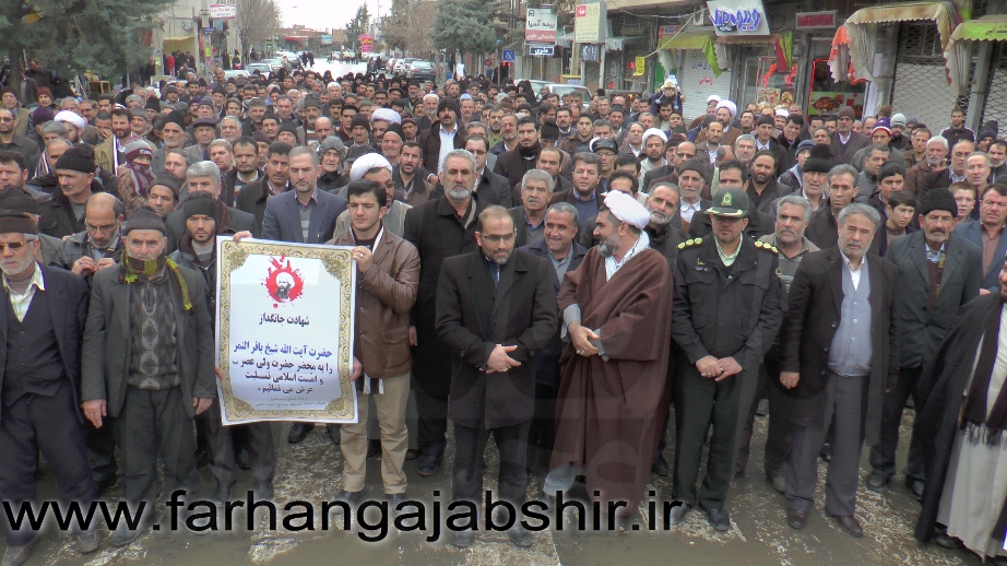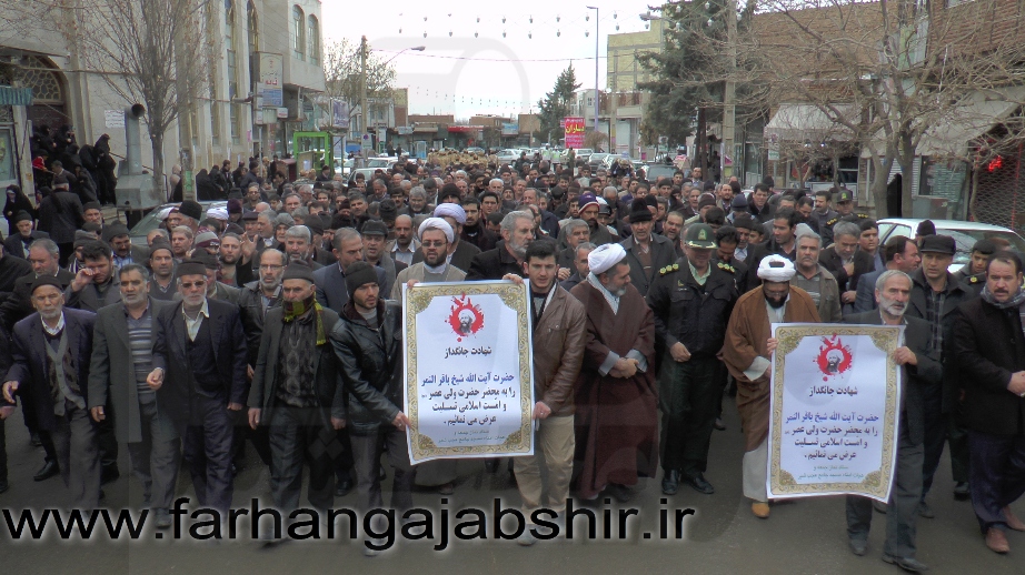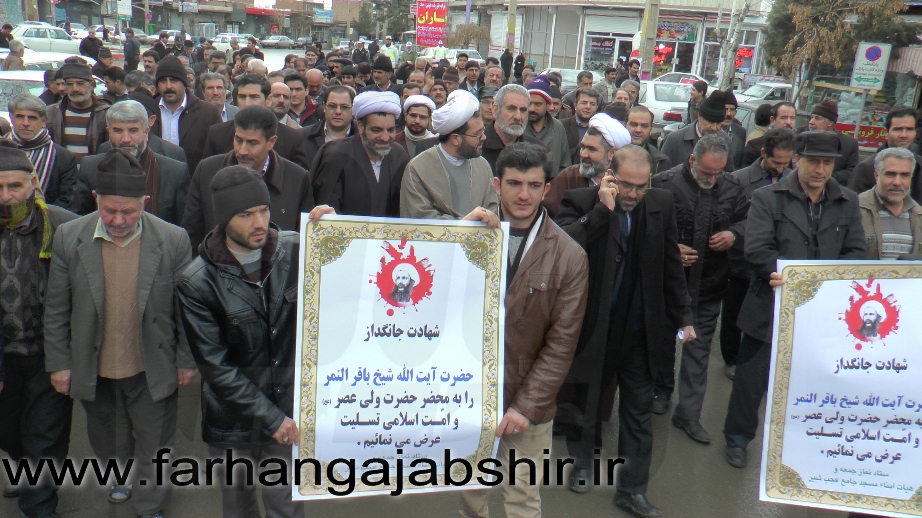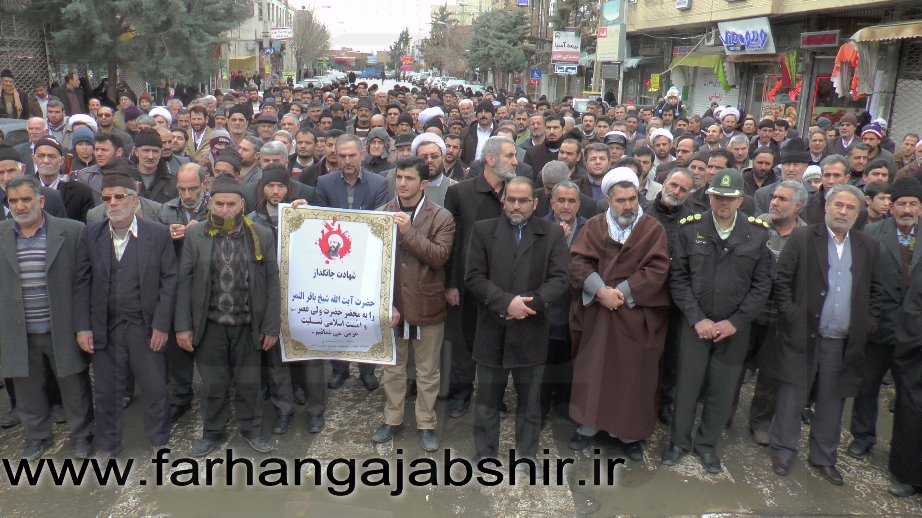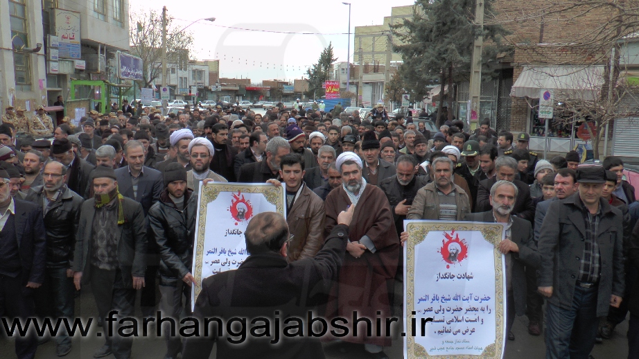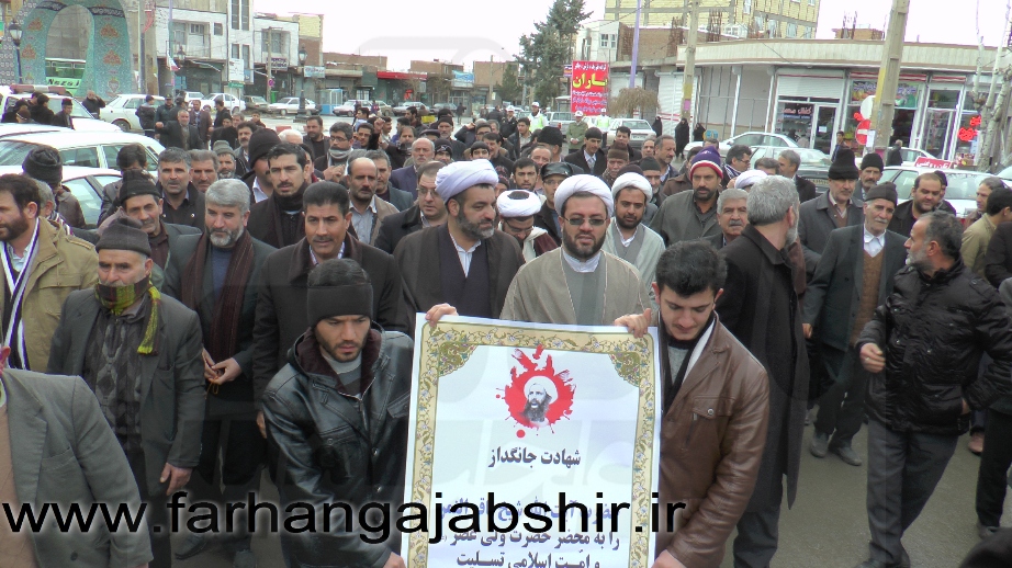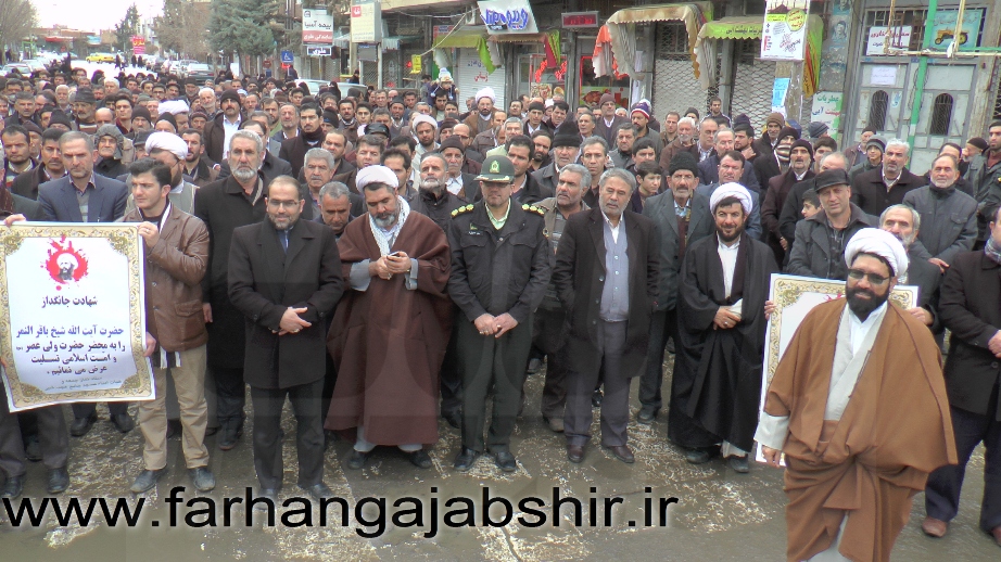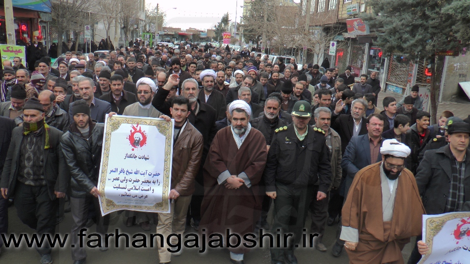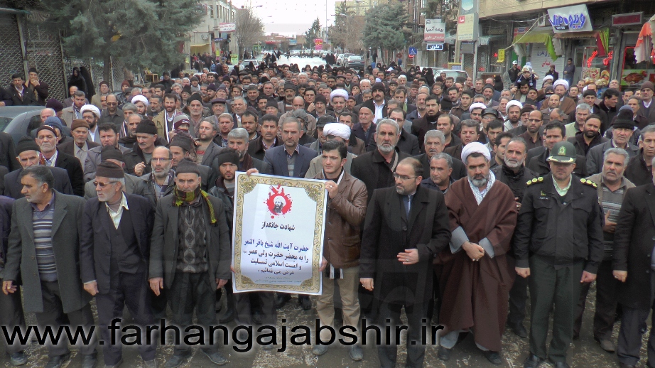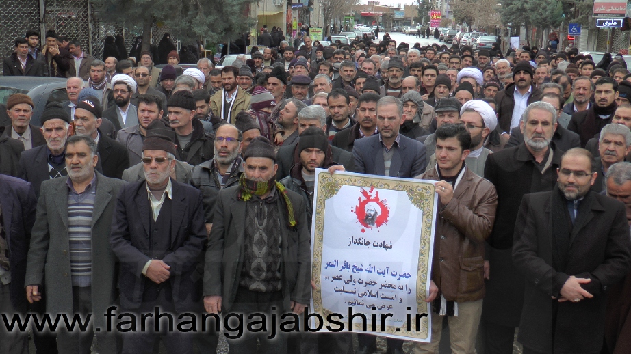در راهپیمایی اعتراض آمیزمردم عجب شیر با شعارها و فریادهای «لا اله الا الله»، «الله اکبر»، «مرگ بر آل سعود کافر»، «مرگ بر آمریکا»، «مرگ بر اسرائیل»، «مرگ بر انگلیس»، « مرگ بر وهابی»، «مرگ بر داعش»«آل سعود یعنی رژیم صهیونیستی»، «آل سعود ننگت باد، مرگت باد»،«عربستان عامل نفاق و تفرقه در جهان اسلام است» ضمن محکوم کردن جنایات عربستان در شهادت این روحانی بزرگوار، اوج نفرت و انزجار خود را از جنایات ضدبشری این رژیمها نشان دادند.