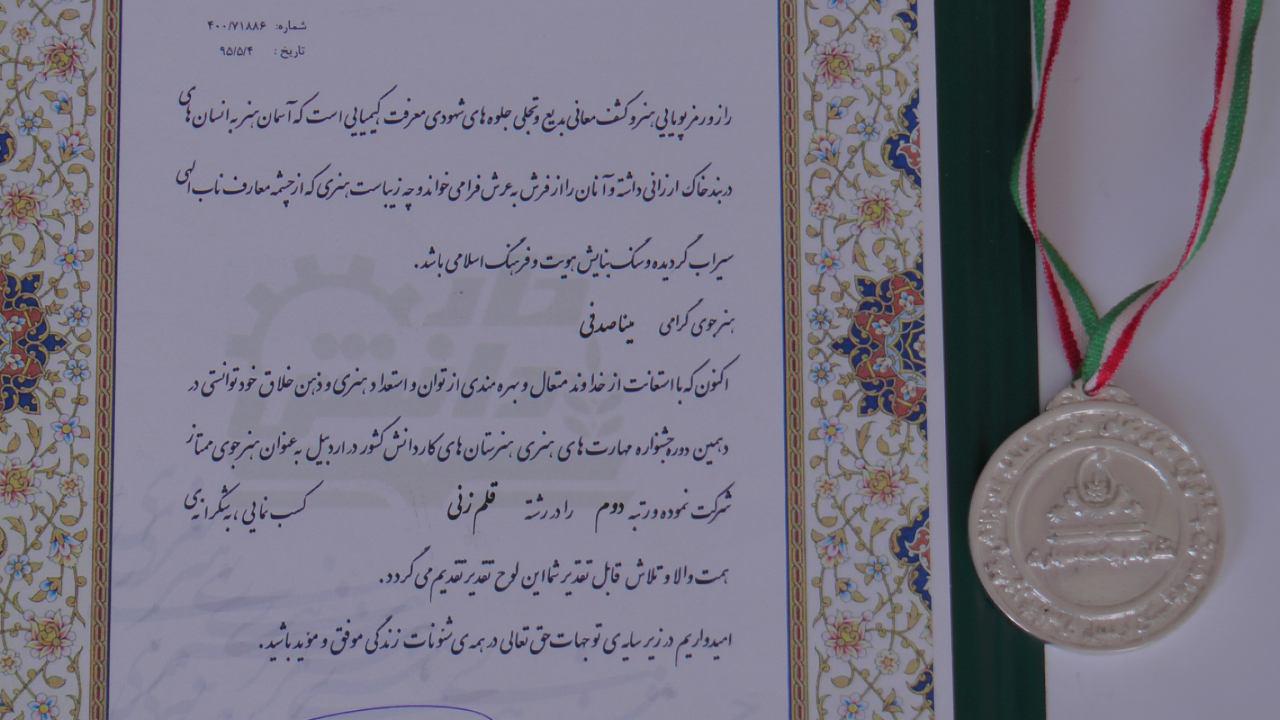 مدیر آموزش و پرورش عجب شیر گفت : دانش آموز ” مینا صدفی ” هنرجوی هنرستان شبانه روزی اسماء شیشوان به عنوان یکی از شایسته ترین نمایندگان استان آذربایجان شرقی در رشته قلم زنی روی فلز رتبه دوم کشوری مرحله نهایی جشنواره مهارتهای هنری شاخه کاردانش کل کشوررا کسب کرد.