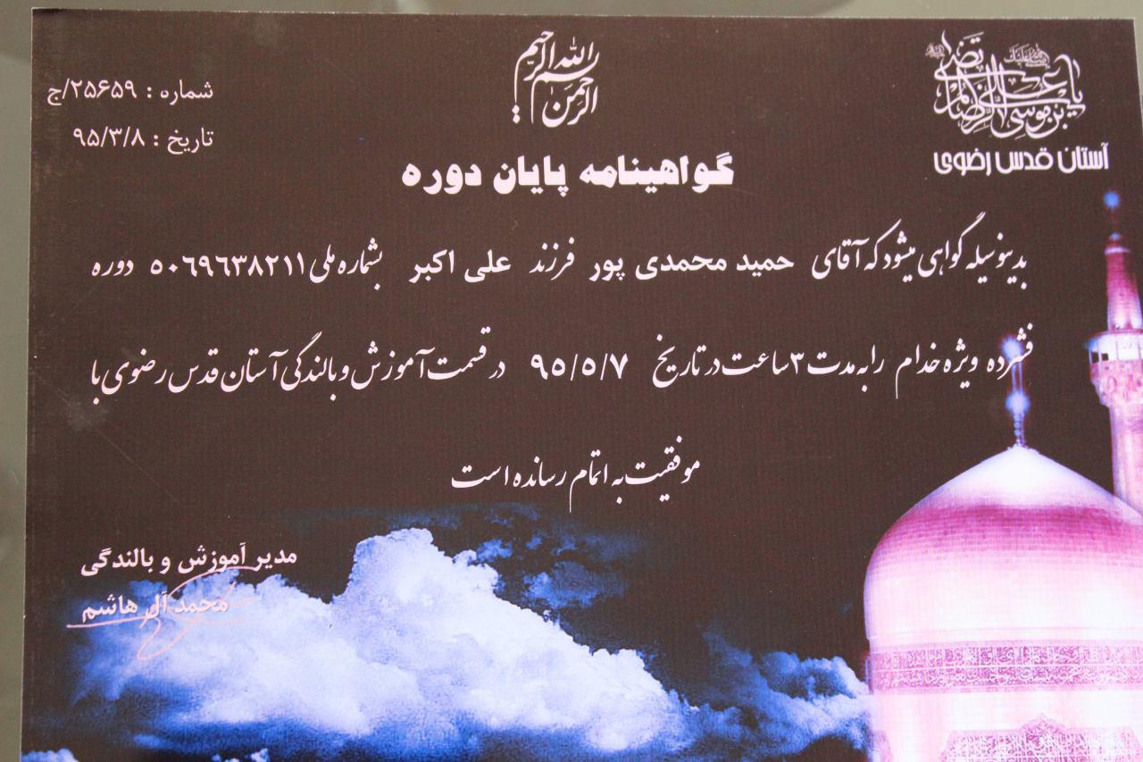 تا اینکه امسال نامه ای بدستم رسید که با درخواستشما موافقت شده است و روز هفتم مرداد ۹۵ در شهر مشهد مقدس حضور داشته باشید ، با شوق و اشتیاق عازم مشهد شدم و با گذراندن یک دوره ۳ ساعته قبل از اذان صبح هفتم مرداد لباس خادمی حرم رضوی را بر تن کردم.