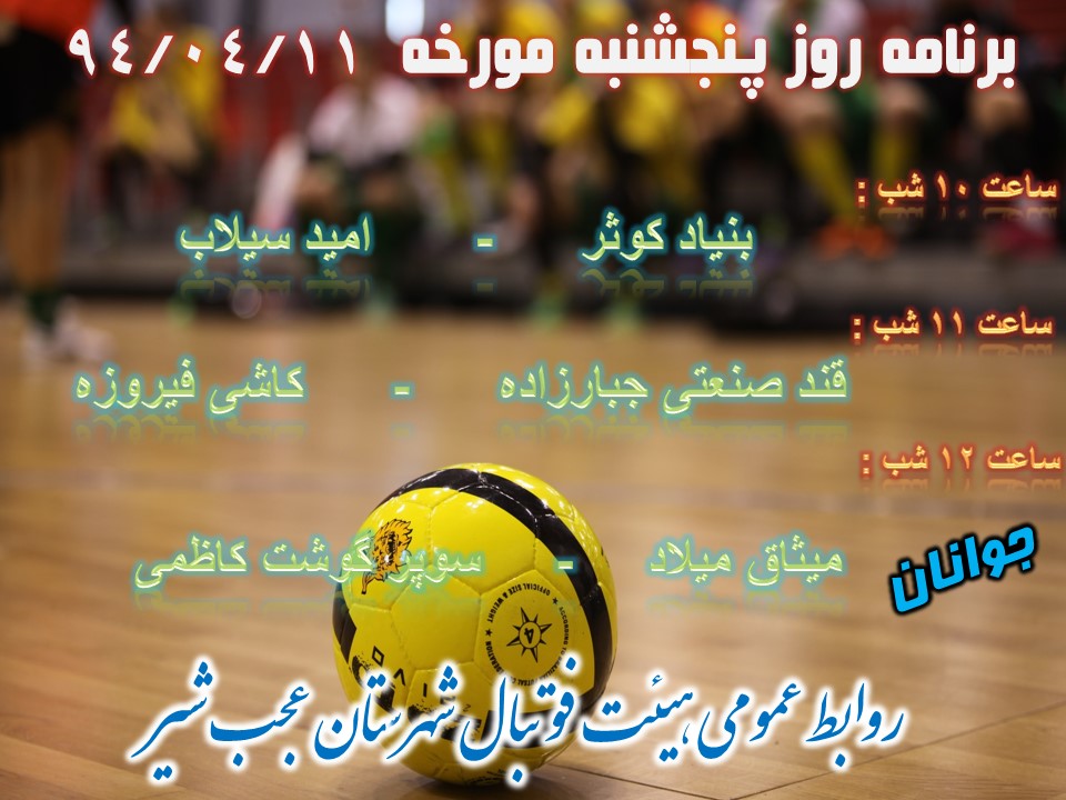 به گزارش فرهنگ عجب شیر به نقل از روابط عمومی هیات فوتبال شهرستان عجب شیر ؛برنامه روز پنجشنبه مورخه ۹۴/۰۴/۱۱مسابقات فوتسال جام رمضان ۹۴ به شرح ذیل اعلام میگردد :