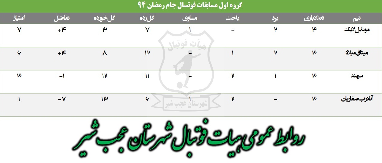 به گزارش فرهنگ عجب شیر، جدول امتیازات گروههای مسابقات فوتسال جام رمضان ۹۴شهرستان عجب شیر به شرح ذیل اعلام شد .