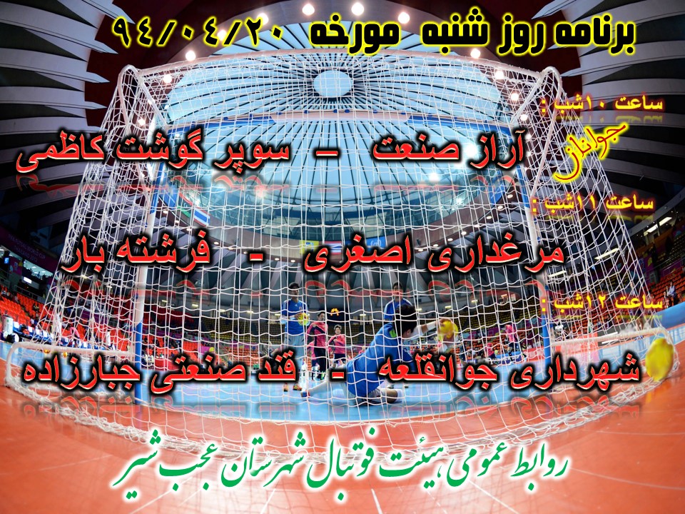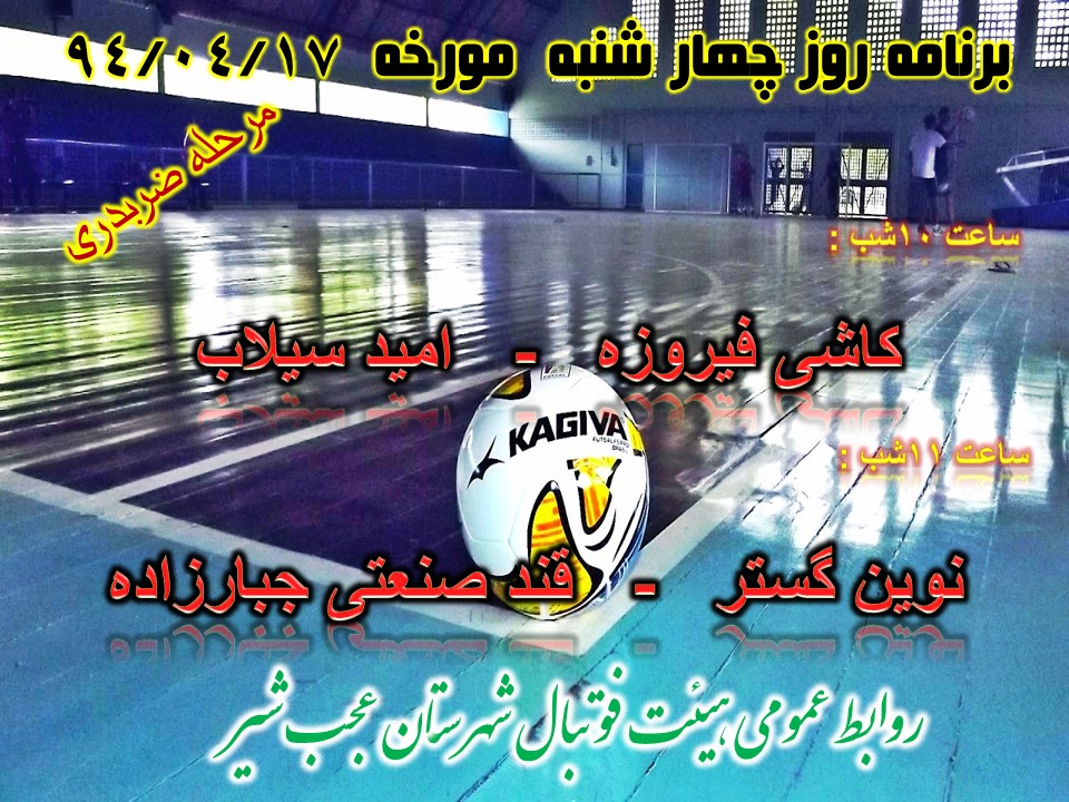 به گزارش فرهنگ عجب شیر به نقل از روابط عمومی هیات فوتبال شهرستان عجب شیر ؛برنامه روز چهارشنبه مورخه ۹۴/۰۴/۱۷مسابقات فوتسال جام رمضان ۹۴ به شرح ذیل اعلام میگردد :