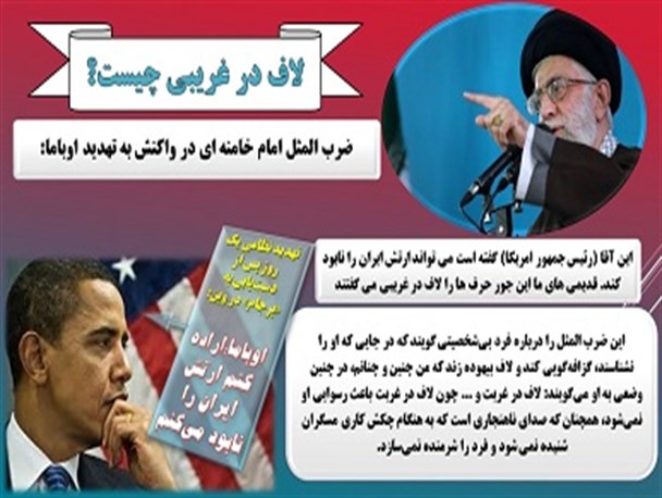 به گزارش فرهنگ عجب شیر،رهبر انقلاب در واکنش به تهدیدات نظامی طرف آمریکایی فرمودند: «این آقا (رئیس جمهور امریکا) گفته است می تواند ارتش ایران را نابود کند. قدیمی های ما این جور حرف ها را لاف در غریبی می گفتند. اگر می خواهند درست بفهمند اگر می خواهند از تجربه های خود درست استفاده بکنند بدانند اگر جنگی این …