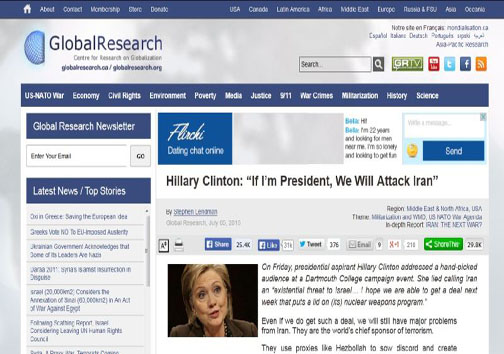 به گزارش فرهنگ عجب شیر به نقل از خبرنگاران،اندیشکده آمریکایی گلوبال ریسرچ (Globalresearch) به بهانه اظهارات ضدایرانی اخیر هیلاری کلینتون، نگاهی داشته به رویکرد جنگ طلبانه این نامزد انتخابات ریاست جمهوری آمریکا و تلاش وی برای جلب رضایت صهیونیست ها در کارزار انتخاباتی. در ابتدای این تحلیل که زیر عنوان “هیلاری کلینتون: اگر من رئیس جمهور شوم، به ایران حمله …