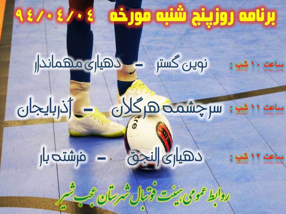 به گزارش فرهنگ عجب شیر به نقل از روابط عمومی هیات فوتبال شهرستان عجب شیر ؛برنامه روزپنج شنبه مورخه ۹۴/۰۴/۰۴ مسابقات فوتسال جام رمضان ۹۴ به شرح ذیل اعلام میگردد :